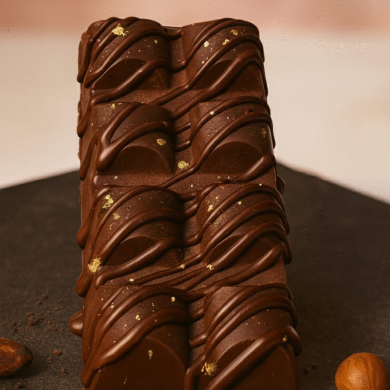 Ingredientes: chocolate 50% (massa de cacau, açúcar, manteiga de cacau, emulsificante lecitina de soja e aromatizante), castanha de caju, creme vegetal de leite de aveia, óleo de coco, cacau em pó, açúcar.
