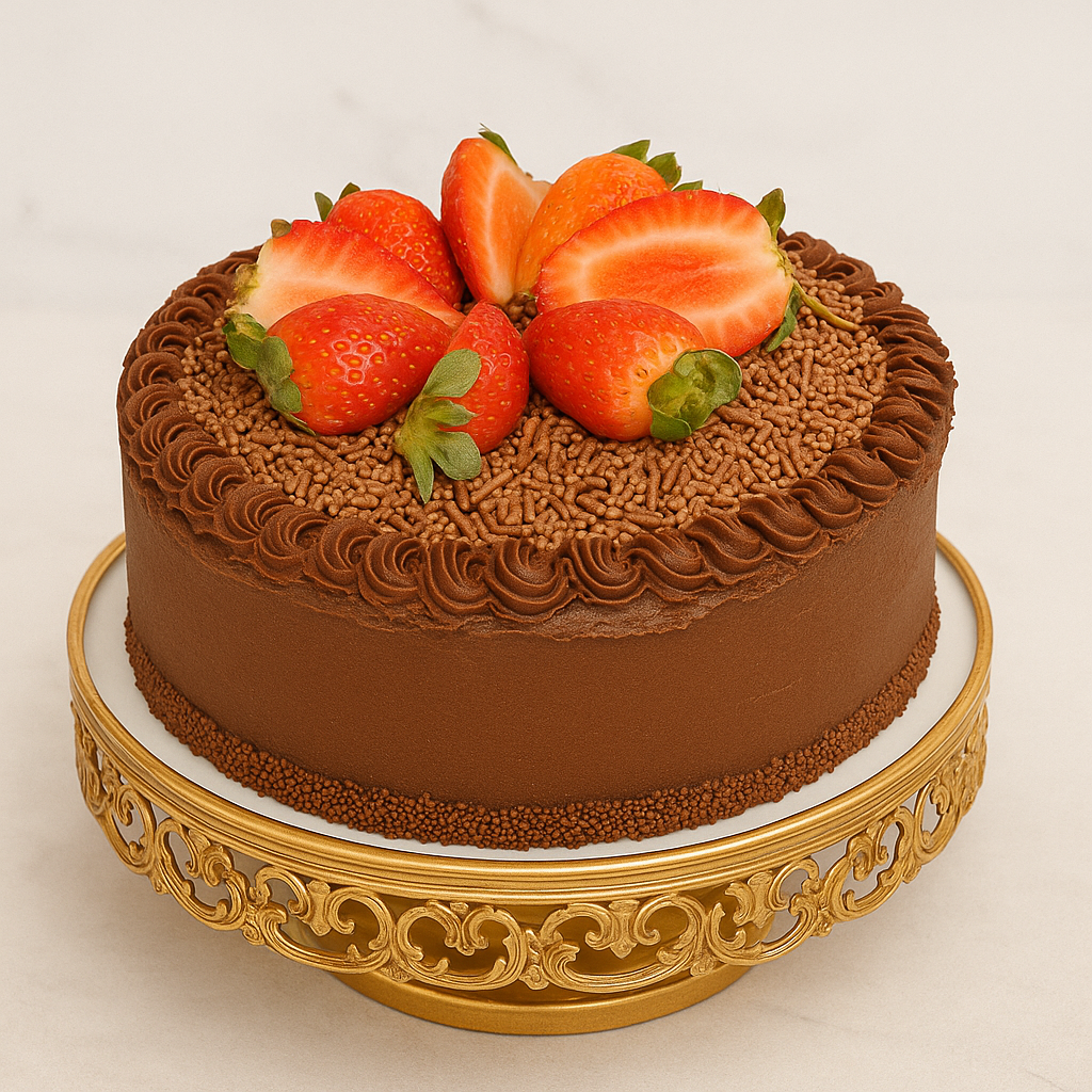 Massa de chocolate com brigadeiro cremoso e morangos frescos.