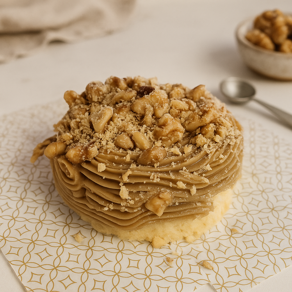 Combinação cremosa de doce de leite com pedaços de nozes.