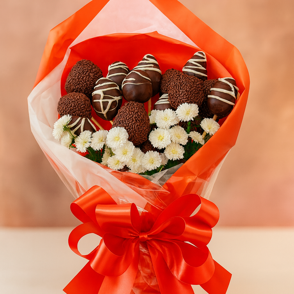 Morangos frescos banhados em chocolate 50% cacau e chocolate branco, montados em formato de buquê. Um gesto carinhoso que une beleza e sabor