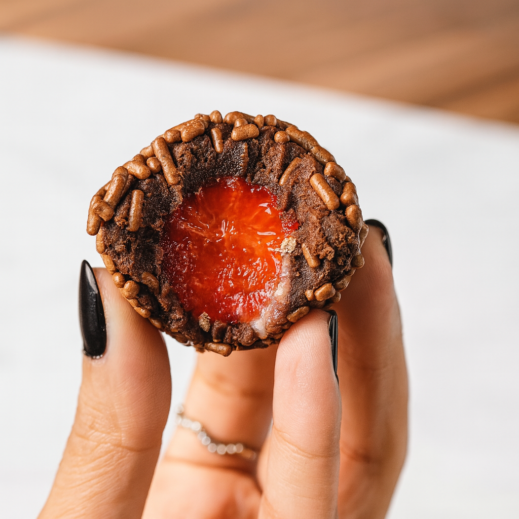 Massa delicada de brigadeiro envolvendo morango fresquinho, finalizada com granulado de chocolate. Uma releitura divertida da coxinha em versão sobremesa, perfeita para encantar e adoçar qualquer momento.