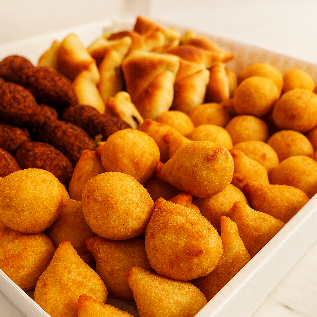 Caixa com 10 unidades de salgadinhos veganos variados, perfeita para matar a fome com praticidade. Os sabores são sortidos e enviados conforme disponibilidade do dia — não há opção de escolha. Uma surpresa deliciosa em cada mordida!