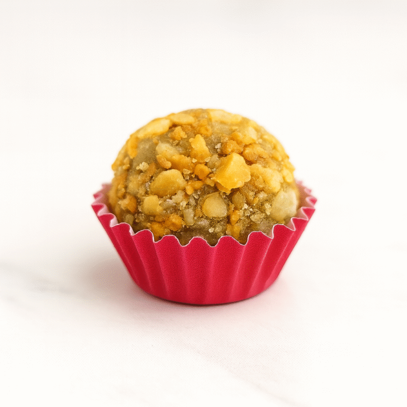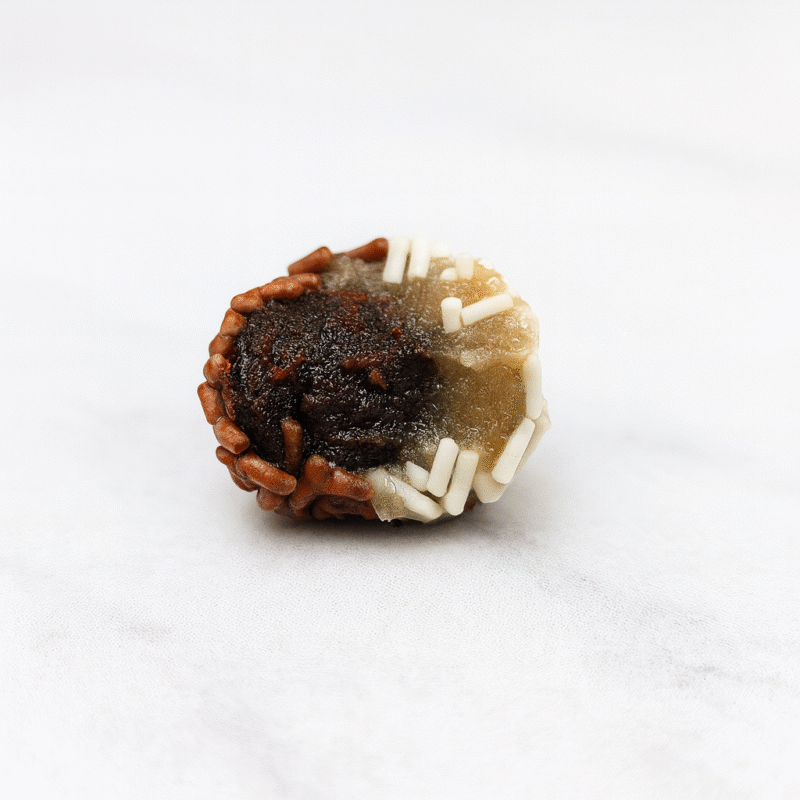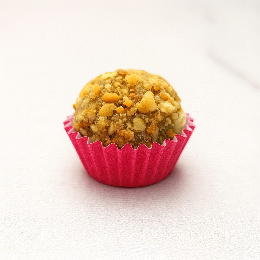 Ingredientes: castanha de caju, açúcar, nozes, chocolate branco (açúcar, manteiga de cacau, gordura vegetal, leite de coco, maltodextrina, farinha de arroz, fibra de tapioca, emulsificante lecitina de girassol e aromatizante).
