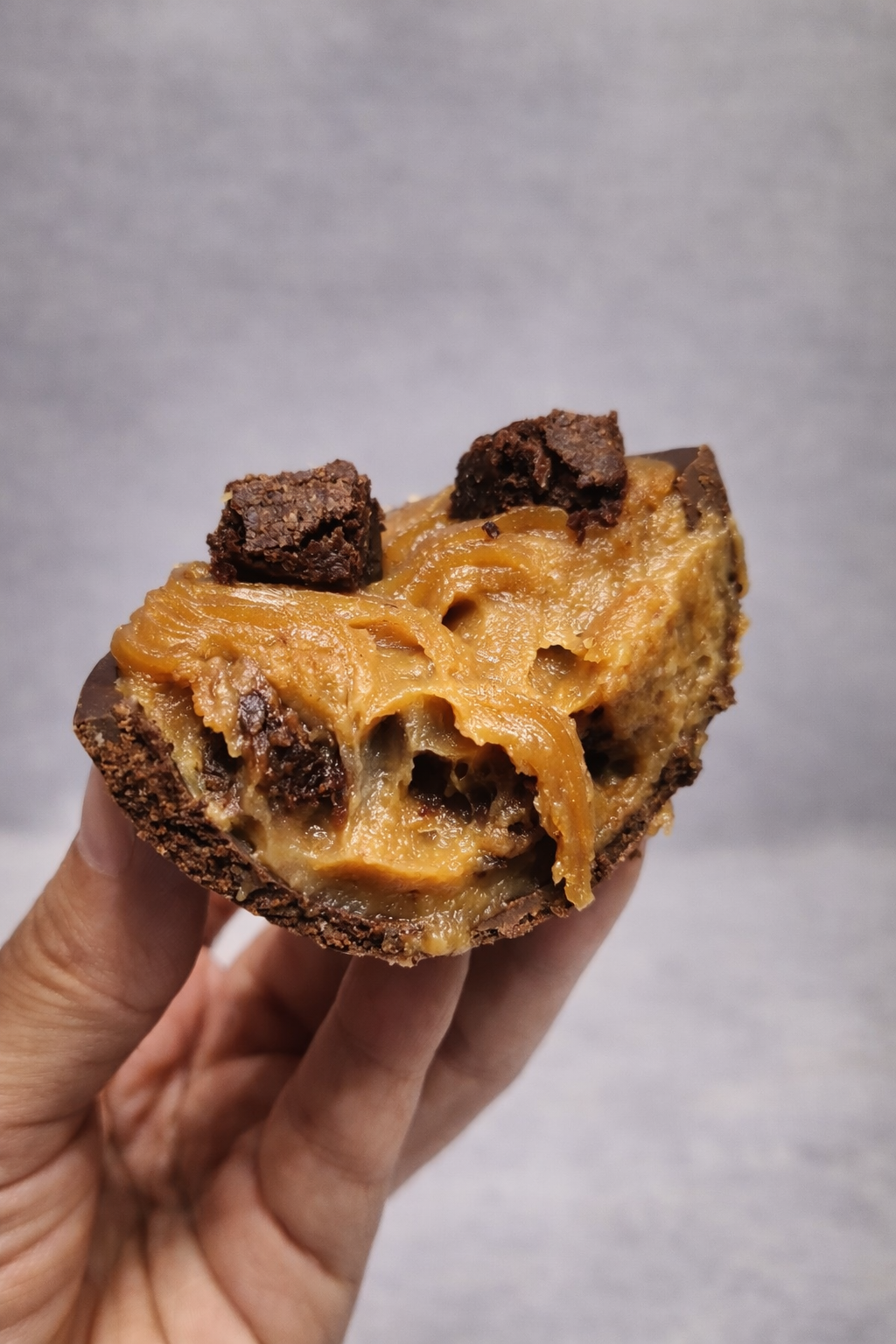 Casca de chocolate 50% recheado com doce de leite vegetal e brownie artesanal.