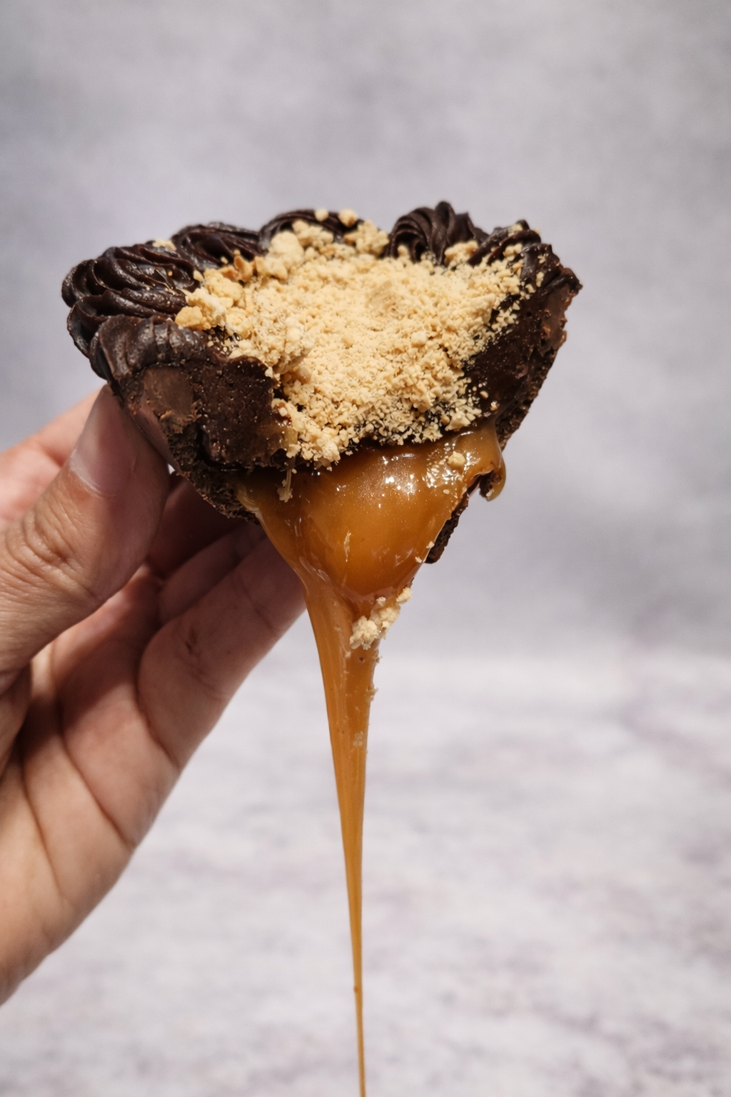 Casca de chocolate 50% com brigadeiro, caramelo salgado e biscoito crocante.