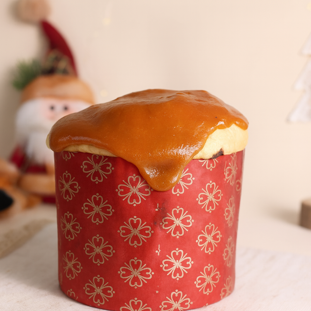 Panetone artesanal feito com massa caseira super macia e nossa essência própria de panetone, preparada com rum, laranja, limão e especiarias. Recheado com caramelo vegano cremoso feito à base de castanha de caju, com toque de flor de sal. Finalizado com cobertura de caramelo salgado e um toque extra de flor de sal por cima.
