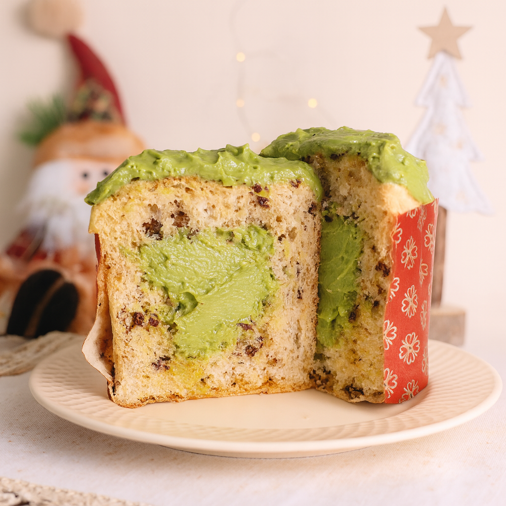 Panetone artesanal feito com massa caseira super macia e nossa essência própria de panetone, preparada com rum, laranja, limão e especiarias. Recheado com creme vegano de pistache (à base de castanha de caju). Finalizado com cobertura de creme de pistache.